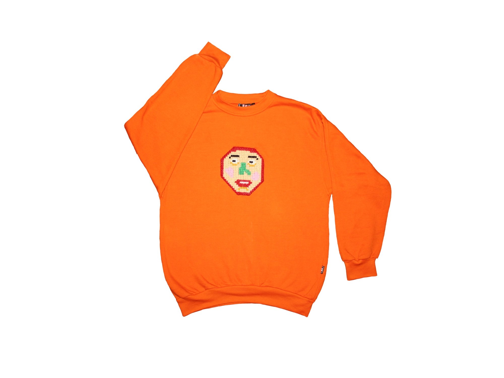 orange pull with cross stich patch